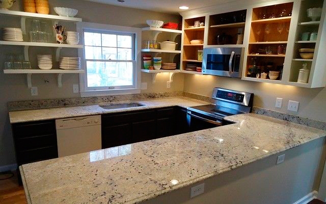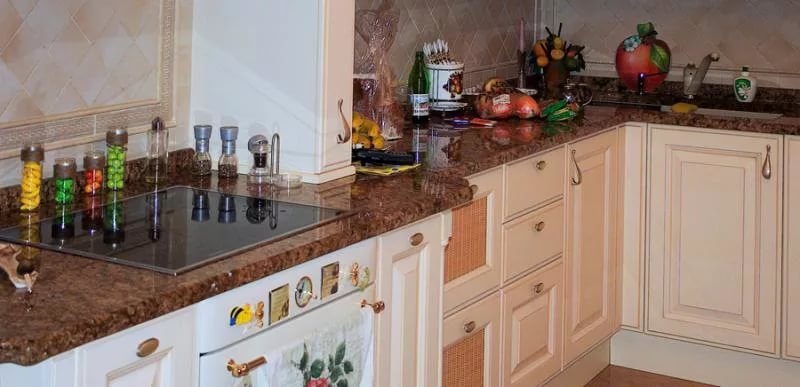 Гранит бывает разных фактур, а также цветовых оттенков, от светло-серого до коричневого. Гранит с прожилками лучше использовать для тех комнат, где много пространства. Если кухня по площади небольшая, то можно использовать гранит одного цвета, без прожилок.