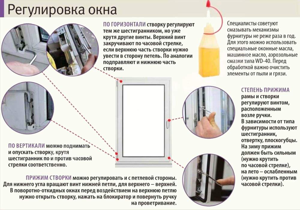 Дело в том, что в разное время года створки таких окон обязаны пребывать в различных положениях. Как это отражается? Летом лучше приспустить створки, а зимой следует плотно закрепить их к раме. Окнам нужна регулировка, которая решает проблемы с затиранием затворок, сменой сезонов, неплотному прилеганию створки к раме.