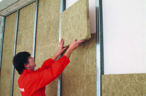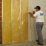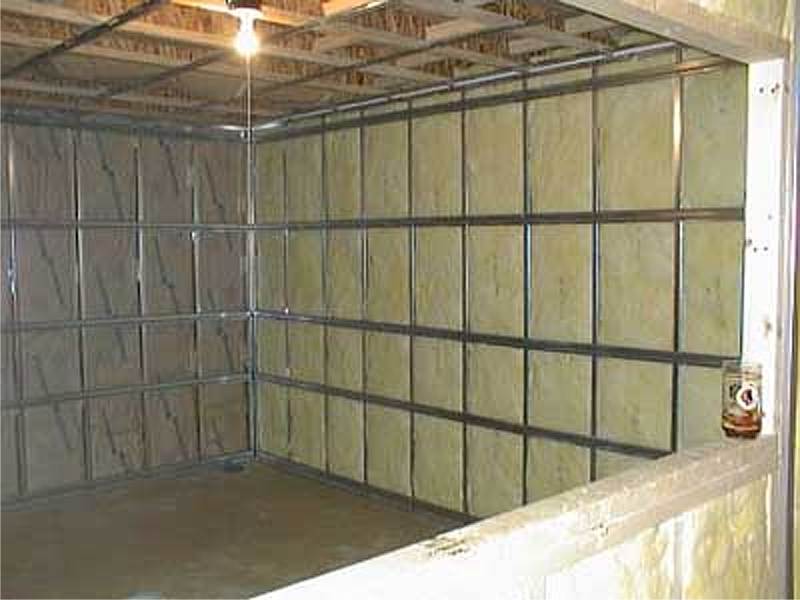 - Для стен также применим принцип полов, а точнее плитки утеплителя. Пусть бруски не касаются стенки, а звукопоглощающие маты укладываются в зазоры. Каркас крепим к стене, улаживаем звукопоглощающую прокладку, чтобы звук не пролез через крепежи, а профиль лучше проклеивать демпирующей лентой.