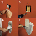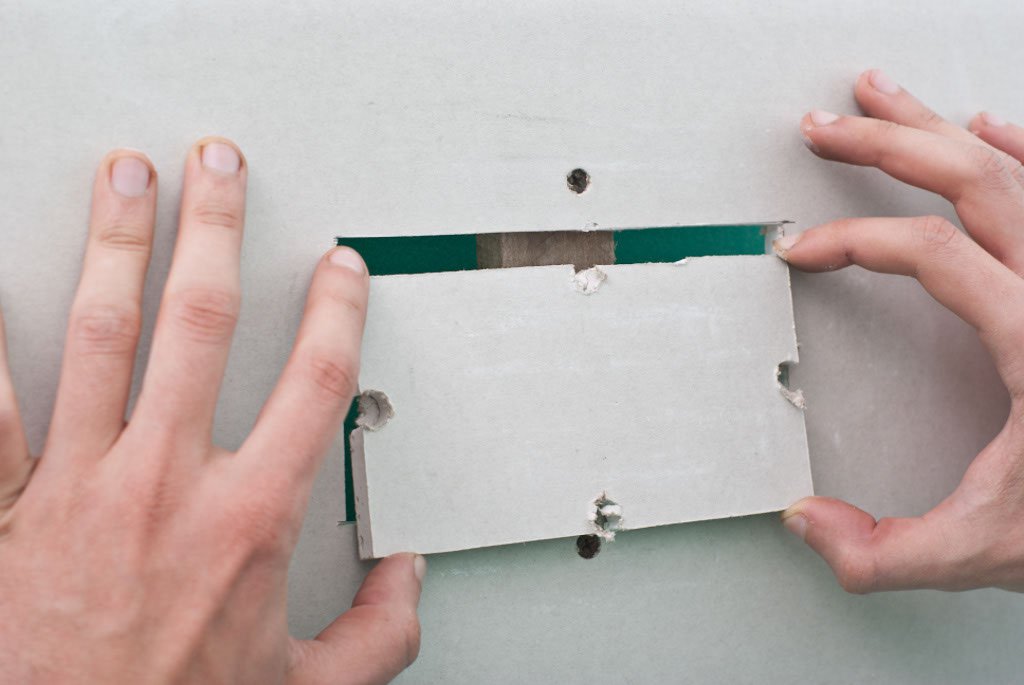 Для этого берем квадратик немного больше, чем дыра, прикладываем его к отверстию и обводим. Теперь вырезаем по контуру в стене квадрат. В который и попадает дыра, чтобы сделать ее края ровными. За дыркой крепим брусок деревянный, закрепляя его на саморезы выше и ниже квадратной дырки. Теперь вставляем и сам квадратик гипсокартона. Теперь нужно все зашпаклевать и выровнять.