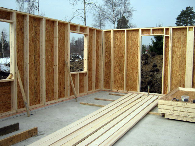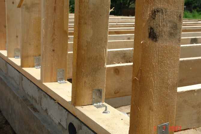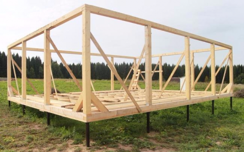 Нижнюю обвязку выполняют из брусьев с пазами. В местах крепления вертикальных досок устанавливают нагели. Сборку щитов начинают с установки угловых стоек, фиксируя брусковые узлы временными распорками. После укрепления последнего бруса выполняют верхнюю обвязку каркаса. При этом потолочные балки должны совпадать с вертикальными стойками.